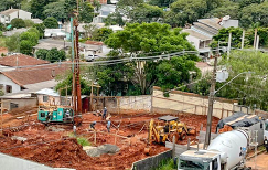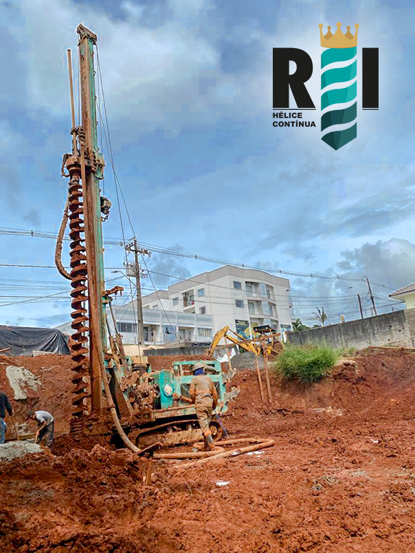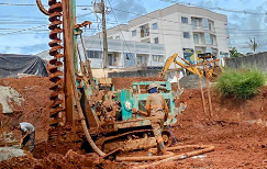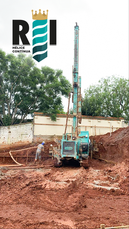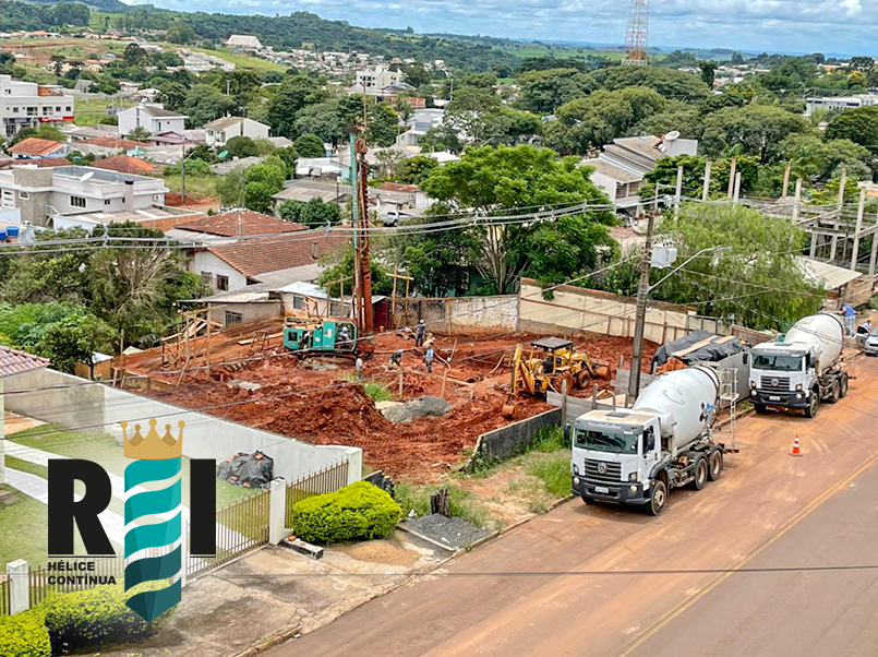 Execução de hélice contínua para centro comerciais e residenciais na cidade de Laranjeiras dos Sul−PR, inicialmente a obra seria com estacas escavadas, porém quando deu inicio a obra foi constatada presença de água, reduzindo a quantidade de 50 estacas escavadas para 32 hélice continua, entre diâmetros de 40 e 50cm, terreno com platôs e com difícil acesso entre eles.